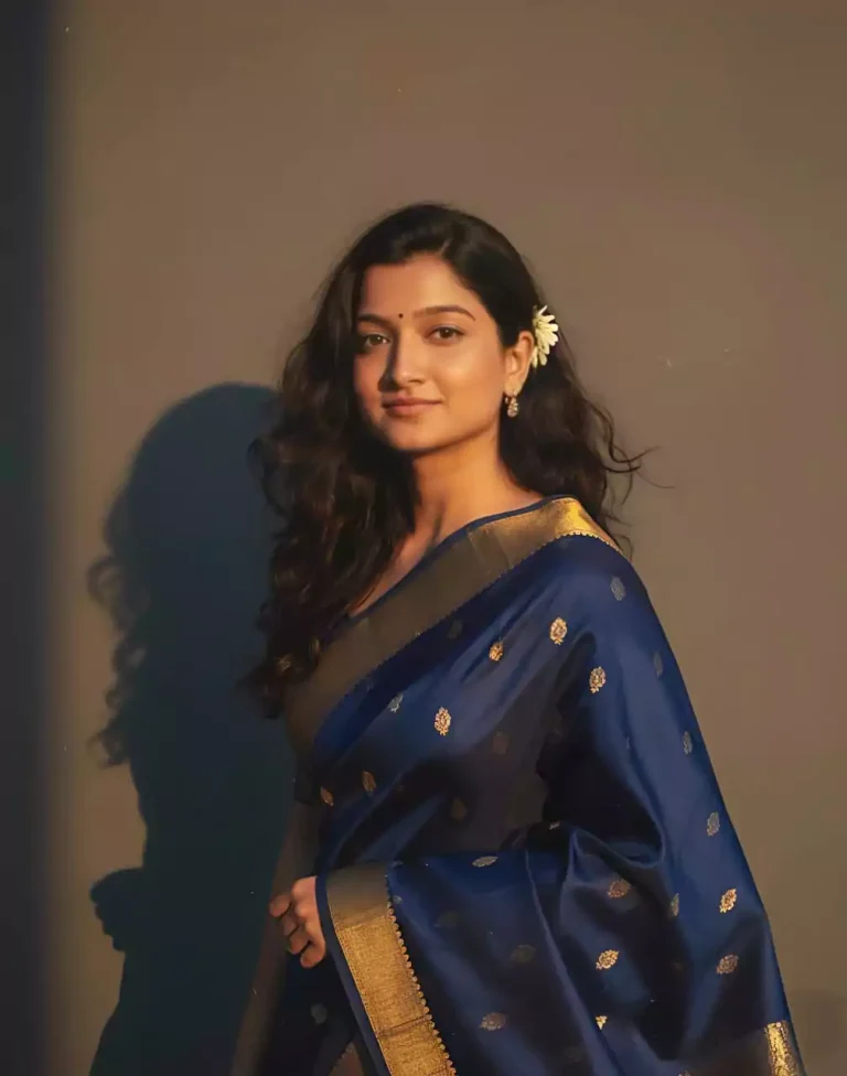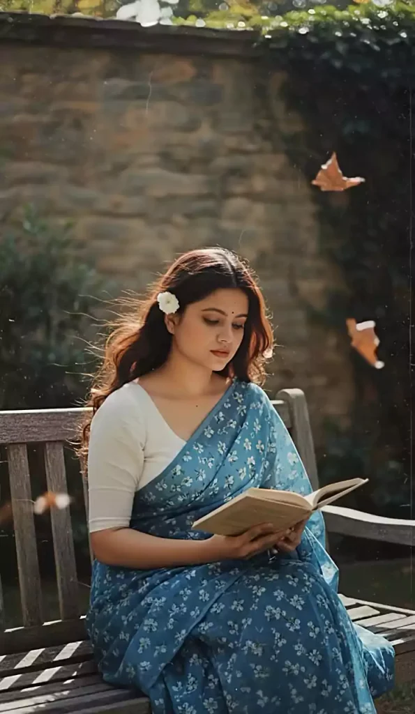 Create a retro, vintage-inspired image - grainy yet bright - based on the reference picture. The girl should be draped in a perfect blue cotton saree with small white flower prints, paired with a white blouse with sleeves above the elbow, styled in a Pinterest-inspired aesthetic. The vibe must capture the essence of a 90s movie dark-brown-haired baddie, with silky hair and a small flower tucked visibly into her hair, enhanced by a windy, romantic atmosphere. She is sitting on a wooden bench as a few leaves blow in the air, while dramatic contrasts add mystery and artistry to the scene, creating a moody yet enchanting cinematic effect. Her pose should suggest that she is reading a book.