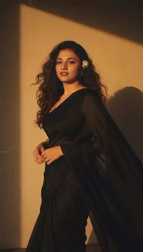 Create a retro vintage grainy but bright image of the reference picture but draped in a perfect plain chiffon saree yellow color Pinteresty aesthetic retro saree. It must feel like a 90s movie dark brown wavy curly hair with a small flower tucked visibly into her curls and romanticising windy environment. The girl is standing against a solid wall deep shadows and contrast drama, creating a mysterious and artistic atmosphere where the lighting is warm with a golden tones of evoking a sunset or golden hour glow. The background is minimalist and slightly textured the expression on her face is moody, calm yet happy and introspective.