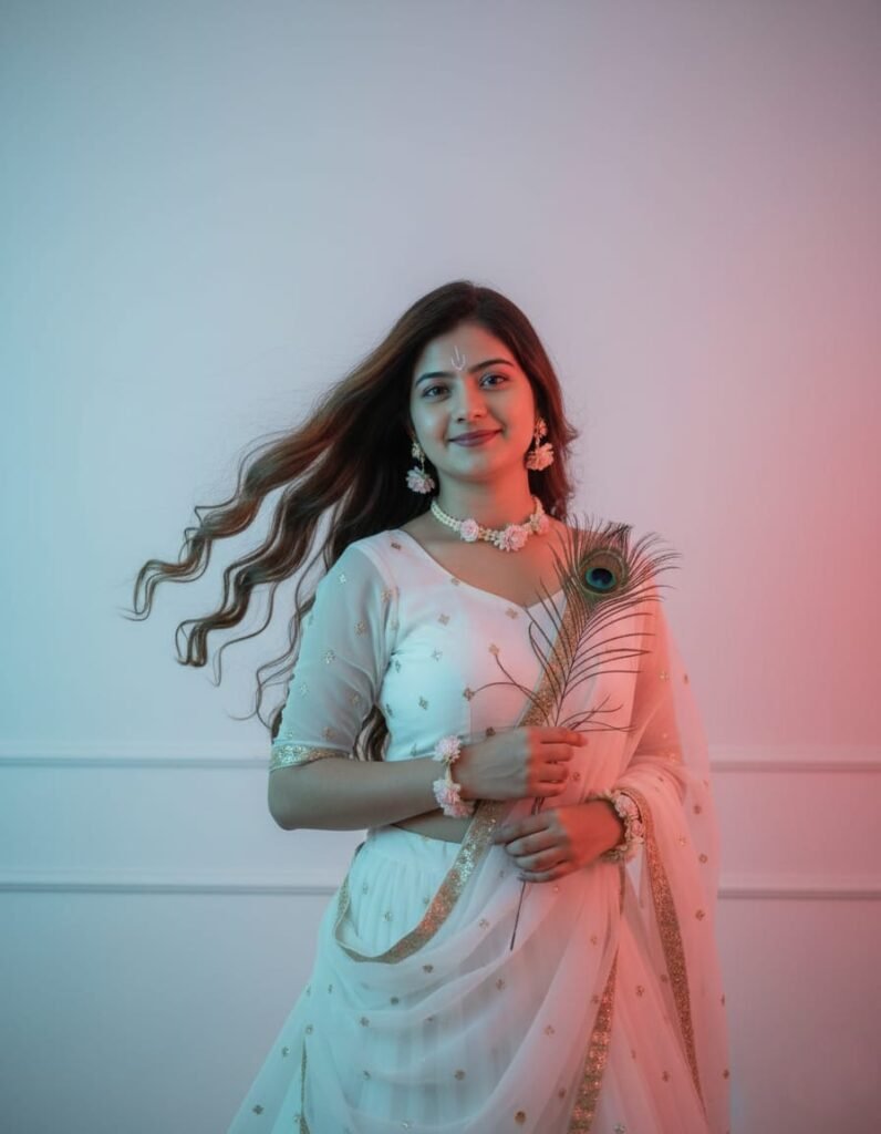 serene expression, where the girl looks like Radha with brown long wavy hair flying & mural art forhead the face but minimal. She's wearing a white aesthetic chiffon lehenga with golden shimmer along with minimal floral jewellery and add peacock featheres on her hand.the background solid white wall. Also, background is minimal, lit with a gradient of warm blue and warm red Hd neon light reflecting on the picture, creating a dreamy and cinematic.